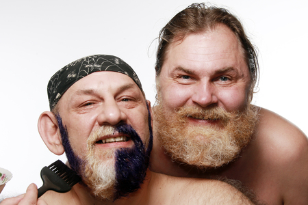 バンダナひげと口ひげをつけた白背景スタジオを染めるときに成人男性のクローズ アップの肖像画 の写真素材 画像素材 Image